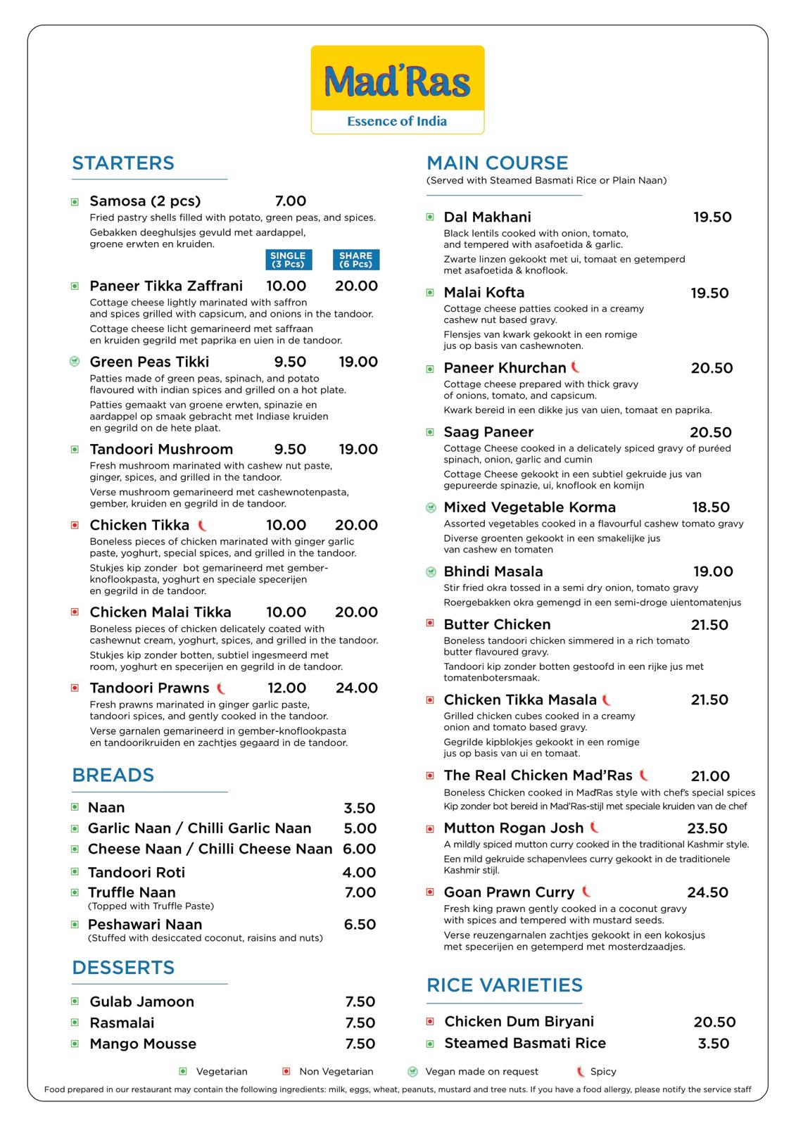 Menukaart van Mad'Ras